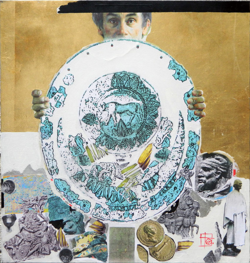 Tehnica: tehnică mixtă- fotografie,acrylic,carton gri,schlagmetal, 21x24 cm