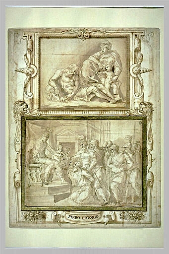 Acest desen-laviu atribuit lui Pirro Ligorio este inspirat după una din binecunoscutele scene ale Columnei lui Traian, la Roma. Foarte probabil este vorba de scena LXXV: Dacii cer pace, după terminarea primului război între Daci şi Romani, în vara anului 102 d.Hr. Compoziţia artistului italian este foarte apropiată după cea antică de pe basorelieful Columnei, cu anumite modificări, în primul rând la personaje: în scena antică a Columnei poziţia destul de statică a împăratului Traian aşezat pe o tribună în piatră a fost înlocuită cu un personaj care este ceva mai mult în mişcare, iar grupul de războinici daci a fost transformat în desenul lui Pirro Ligorio într-un grup de « Barbari » prizonieri. Menţionăm că grupul Dacilor reprezentaţi pe « tabloul » sculptat în piatră al Columnei lui Traian, grup ce se găseşte în faţa împăratului roman, nu reprezintă « Barbari » făcuţi prizonieri, ci se află în situaţie de supuşi şi care cer pace. Mai precizăm, în ceea ce priveşte cei doi nobili daci îngenuncheaţi la picioarele lui Traian, desigur două căpetenii importante, nu prezintă mâinile legate la spate cum sunt reprezentaţi în laviul artistului napolitan.