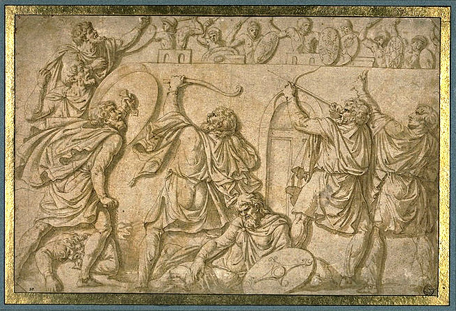 Giulio Pippi de’ Jannuzzi, numit Giulio Romano, este cunoscut în franceză sub numele de Jules Romain, născut la Roma în anul 1492 sau 1499 şi mort la Mantova la 1 noiembrie 1546, este un pictor, arhitect şi decorator italian, unul din primii artişti manierişti ai Renaşterii şi elevul favorit şi principal colaborator al lui Raffaello între anii 1515 şi 1520. De-a lungul carierei sale artistice artistul italian a adoptat o tendinţă spre studiul stilului antic ce va marca perioada sfârşitului vieţii lui. După cum se poate recunoaşte destul de uşor, acest desen reprezintă una dintre binecunoscutele compoziţii ale Columnei lui Traian (Roma). Este vorba de scena XXXII în care Dacii asediază pe Romani, refugiaţi într-o fortăreaţa. Giulio Romano a reprezentat remarcabil pe Daci în desenul său, inspirându-se după una din scenele Columnei şi care ne oferă detalii importante: costumul Dacilor, specificul armamentului lor, figurile expresive ale acestor războinici redutabili, tactica şi felul acestora de a ataca inamicul şi de a lupta individual. Stilul liniei desenului este artistic, precis, plastic, caracteristic acestui artist, maniera de a reda volumele, în funcţie de lumina şi umbra redată, proporţia personajelor este bine respectată, etc.; un desen de bună o calitate artistică.