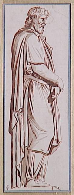 Jacques Louis David (1748-1825), pictor francez, este considerat ca fiind fondatorul Şcolii neoclasice, revendicând moştenirea clasicismului lui Nicolas Poussin şi ale idealurilor estetice greceşti şi romane, căutând să regenereze artele. A urmat cursurile Academiei regale, după care, începând cu anul 1780, el devine un pictor renumit, cu tabloul « Le Serment des Horaces ». Numeroasele sale opere sunt expuse în majoritatea muzeelor din Europa (o bună parte se află la Muzeul Luvru) şi în Statele Unite ale Americii. În picturile sale predomină subiectele istorice şi portretele. Jacques Louis David acordă un loc important compoziţiilor istorice inspirate din subiecte mitologice (Andromakhe, Marte dezarmat de Venus, etc.) sau din istoria antică romană şi greacă (Brutus, Sabinele, Leonidas, etc.). În perioada Revoluţiei franceze artistul încearcă să adapteze inspiraţia sa antică la subiectele contemporane lui (« Le Serment du jeu de paume », « La Mort de Marat », « Le Sacre »). De asemenea portretul ocupă un loc aparte în pictura sa. La începutul carierei sale artistice şi până la Revoluţia franceză a realizat portrete apropiaţilor lui, persoanelor de relaţie, de personalităţi cunoscute din anturajul său, precum şi autoportrete. Opera grafică a lui David este inspirată din arta antică ce i-a servit în marile sale compoziţii picturale, cum se poate admira în aceste desene-studii după cunoscutele reprezentări de Daci din frizele Columnei lui Traian şi statuile de Daci, ce provin (în mare parte) din Forul lui Traian, la Roma. Stilul lui Jacques Louis David, un drum artistic evolutiv, va continua să se contureze din ce în ce mai mult ajungând a fi caracterizat ca un stil propriu. Portretele realizate de David sunt aproape de naturalism spre o evoluţie psihologică. Aportul nou adus în artă de acest pictor se caracterizează prin faptul că a ştiut să combine cu mult talent inspiraţia estetică şi morală în neoclasicismul său.